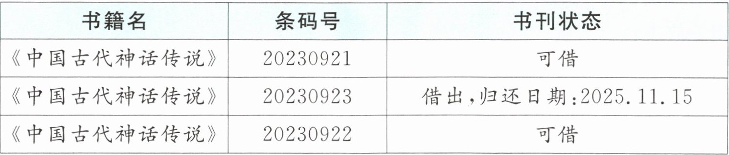 老师推荐同学们阅读《中国古代神话传说》,于是红红去图书馆借阅这本书,在图书馆公共查询系统中,她看到了如下信息:(选做题)