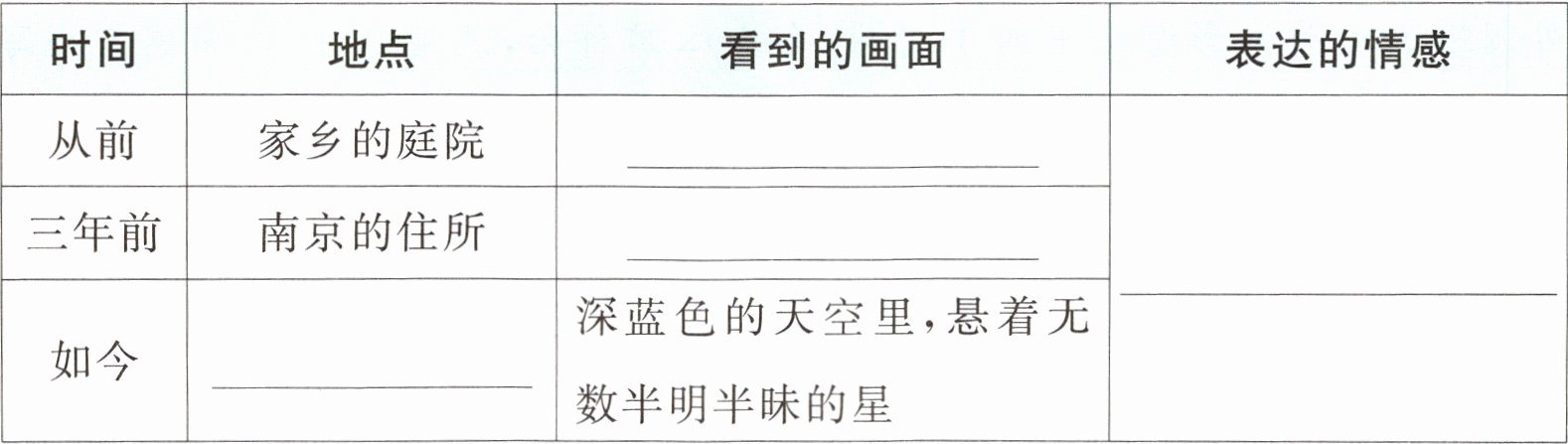 五 根据课文内容想象画面,完成表格。