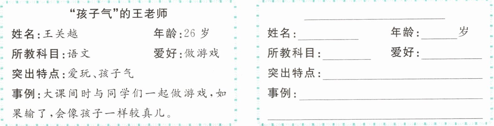 观察身边的老师,照样子,给所选的老师制作“人物档案卡”,梳理习作思路。