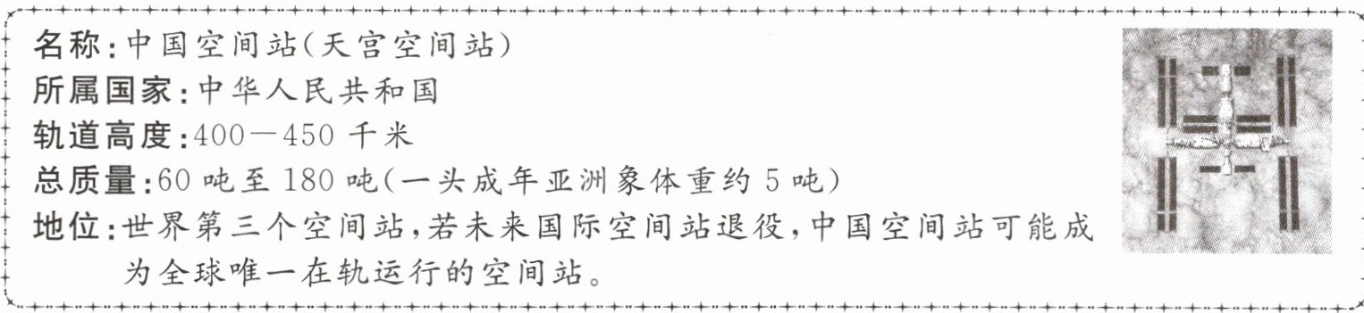 示例:你知道吗?在距离地球 400—450 千米的太空中,有一个由我国建成的太空实验室,它就是中国空间站,也叫天宫空间站。它是世界上第三个空间站,总质量为 60 吨至 180 吨,最重时相当于 36 头成年亚洲象的总重量。空间站就像是我们在太空中建的一家酒店,我们的航天员可以入住“天宫酒店”,在里面工作和生活,每隔一段时间一批航天员回到地球,它还会迎来一批新的航天员“客人”。若未来国际空间站退役,它可能成为全球唯一在轨运行的空间站。