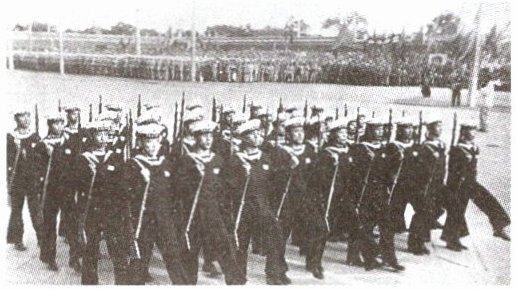 开头是海军两个排,雪白的帽子,跟海洋一个颜色的蓝制服。接着是步兵一个师,以连为单位,列成方阵,齐步行进。接着是炮兵一个师,野炮、榴弹炮等各式各样的炮,都排成一字形的横列前进。接着是一个战车师,各种装甲车和坦克车两辆或三辆一排,整整齐齐地前进;战士们挺着胸膛站在战车上,像钢铁巨人一样。接着是一个骑兵师,“红马连”一色红马,“白马连”一色白马,六马并行,马腿的动作完全一致。以上这些部队,全都以相等的距离和相同的速度经过主席台前。当战车部队经过的时候,人民空军的飞机也一队队排成人字形,飞过天空。毛主席首先向空中招手。群众看见了,都把头上的帽子、手里的报纸和别的东西抛上天去,欢呼声盖过了飞机的隆隆声。