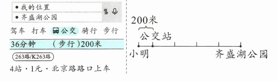 三 [新情境]小明在地图上搜索了去齐盛湖公园的公交路线,每站公交大约700米,从他的位置到齐盛湖公园大约多少千米?