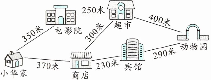 答:小华从家经过商店、宾馆到动物园最近,要走890米。