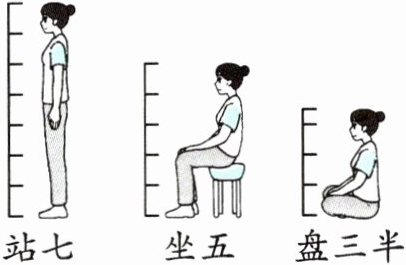 三 [新素材]我国古代就有“站七、坐五、盘三半”之说。“站七”就是以头长为一个单位,人的身高一般为七个单位,即是头长的7倍(如图)。丽丽的头长是21厘米,她站着的时候有多高?她坐着的时候有多高?