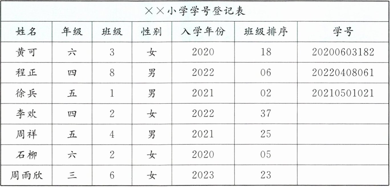 下面是某小学部分学生学号登记表,请你找一找学号的编排有什么规律,然后根据你找出的规律给没有学号的学生编上学号。