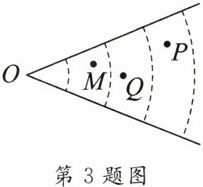 3. 体育课上,小明在点 $ O $ 处进行了三次铅球试投,铅球分别落在图中的 $ M $、$ P $、$ Q $ 三个点处,则表示他最好成绩的点是(