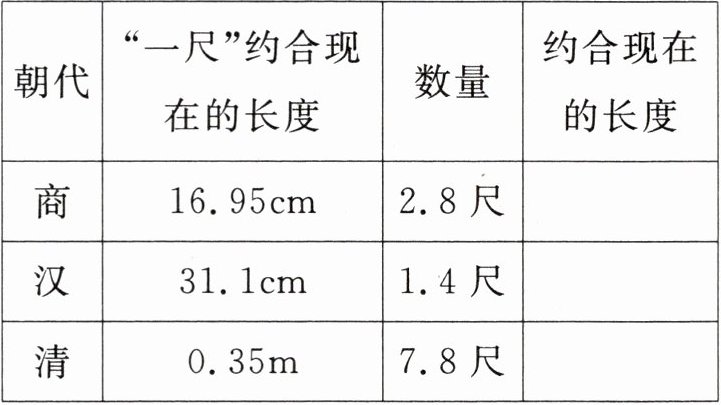 (跨学科)“危楼高百尺,手可摘星辰。”这两句诗出自唐代诗人李白的《夜宿山寺》。古代的“一尺”与现在的长度关系如下,请根据表中的信息算一算,填一填。