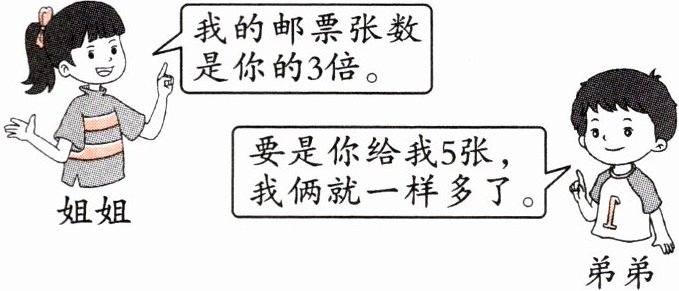 解:设弟弟有邮票 $x$ 张,则姐姐有邮票 $3x$ 张。