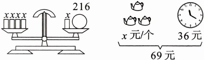 根据天平平衡原理,左边$4$个$x$的重量等于右边$x + 216$的重量,可列方程$4x=x + 216$。