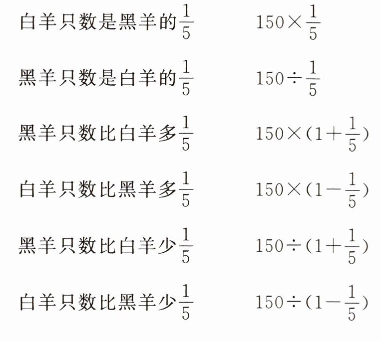 黑羊只数是白羊的$\frac{1}{5}$——150×$\frac{1}{5}$