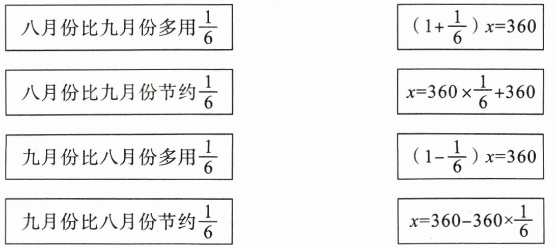 八月份比九月份多用$\frac{1}{6}$ (1+$\frac{1}{6}$)$x$=360;八月份比九月份节约$\frac{1}{6}$ $x$=360×$\frac{1}{6}$+360;九月份比八月份多用$\frac{1}{6}$ (1-$\frac{1}{6}$)$x$=360;九月份比八月份节约$\frac{1}{6}$ $x$=360-360×$\frac{1}{6}$