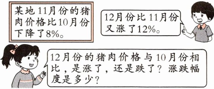 $1× (1-8\%)× (1+12\%)=1× 92\%× 112\%=1.0304$ $(1.0304-1)÷ 1=3.04\%$ 答:12月份的猪肉价格与10月份相比是涨了,涨了3.04%。