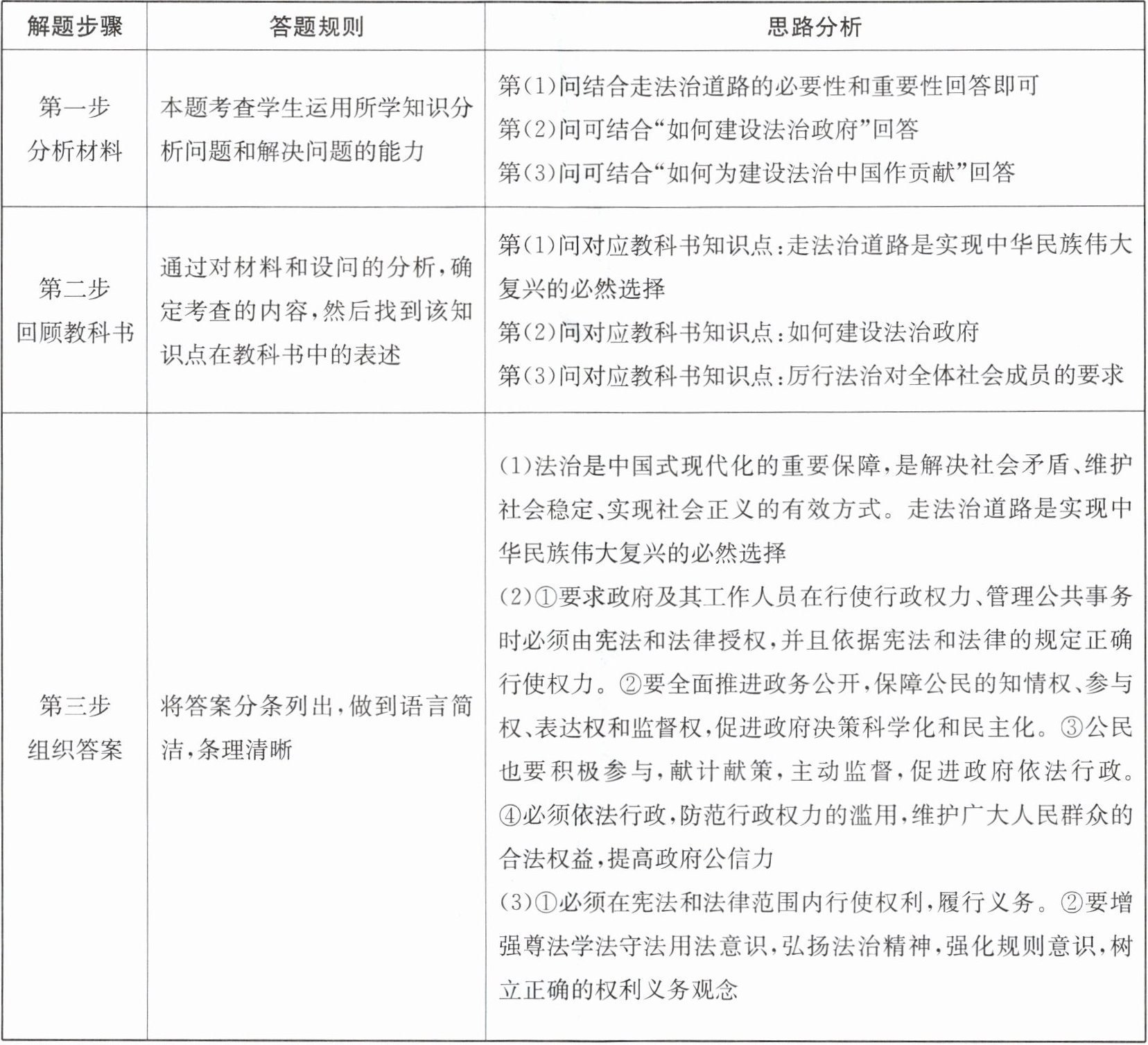 |第二步回顾教科书|通过对材料和设问的分析,确定考查的内容,然后找到该知识点在教科书中的表述|第(1)问对应教科书知识点:走法治道路是实现中华民族伟大复兴的必然选择