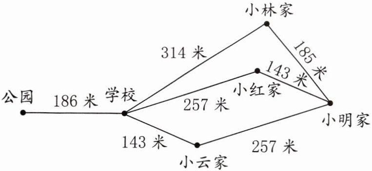 1. 路线1:小明家→小红家→学校,距离为143米+257米=400米。