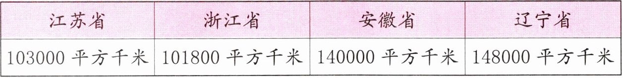 $148000$平方千米(辽宁省)$ \gt 140000$平方千米(安徽省)$ \gt 103000$平方千米(江苏省)$ \gt 101800$平方千米(浙江省)。