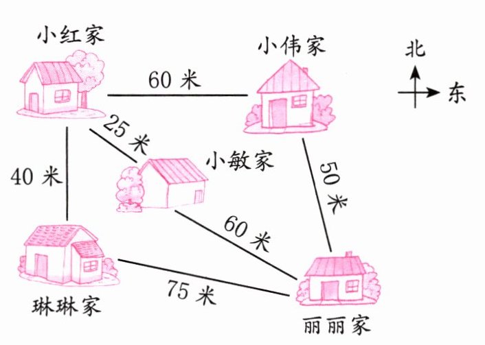 路线三:小红从家出发,先向(南)走(40)米到(琳琳)家,再向(东北)走(75)米到丽丽家。