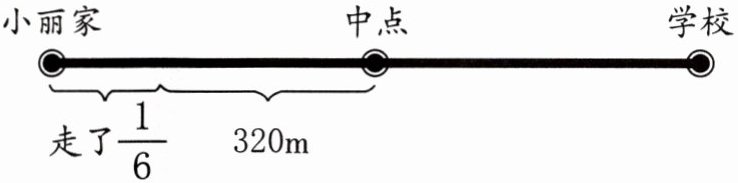 (3)总路程为单位“1”,已走的路程为$\frac{1}{6},$到中点为$\frac{1}{2},$则$\frac{1}{2}-\frac{1}{6}=\frac{1}{3}$的路程是320米,所以从小丽家到学校的距离为:
