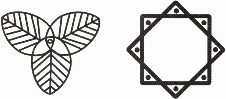 左图:以一个基本图形(叶片形状)为基础,绕中心旋转120°、240°得到三个相同叶片,组合而成。