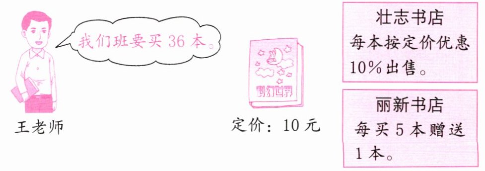 丽新书店:36÷(5 + 1)=6,5×6 = 30(本),只需买30本就送6本,30×10 = 300(元)