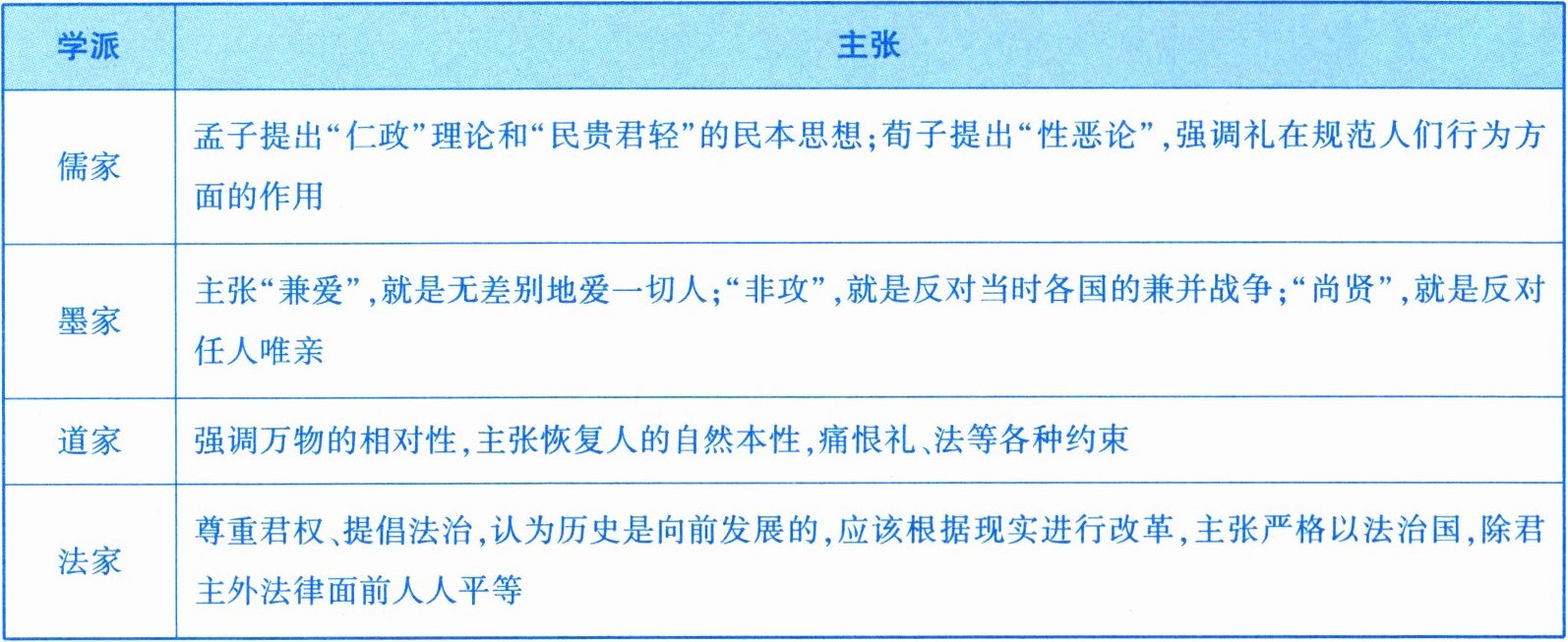 |儒家|孟子提出“仁政”理论和“民贵君轻”的民本思想;荀子提出“性恶论”,强调礼在规范人们行为方面的作用|