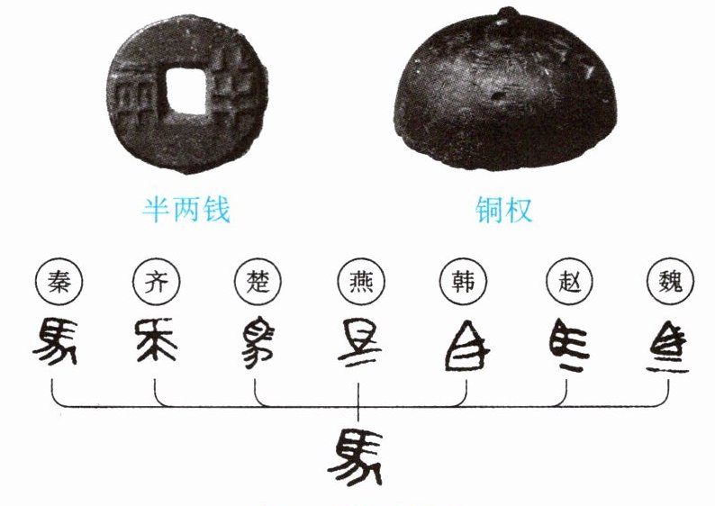 材料一 秦始皇统一中国后,以咸阳为中心,修筑了通往全国重要地区的驰道;同时还统一了车轨的宽度;又以秦国文字为基础,整理出笔画较为简便的小篆,定为通行的标准文字;秦废止六国所用的形形色色的货币,以圆形方孔半两钱作为统一货币;秦始皇还下令沿用商鞅所制的度量衡,作为全国统一的标准。