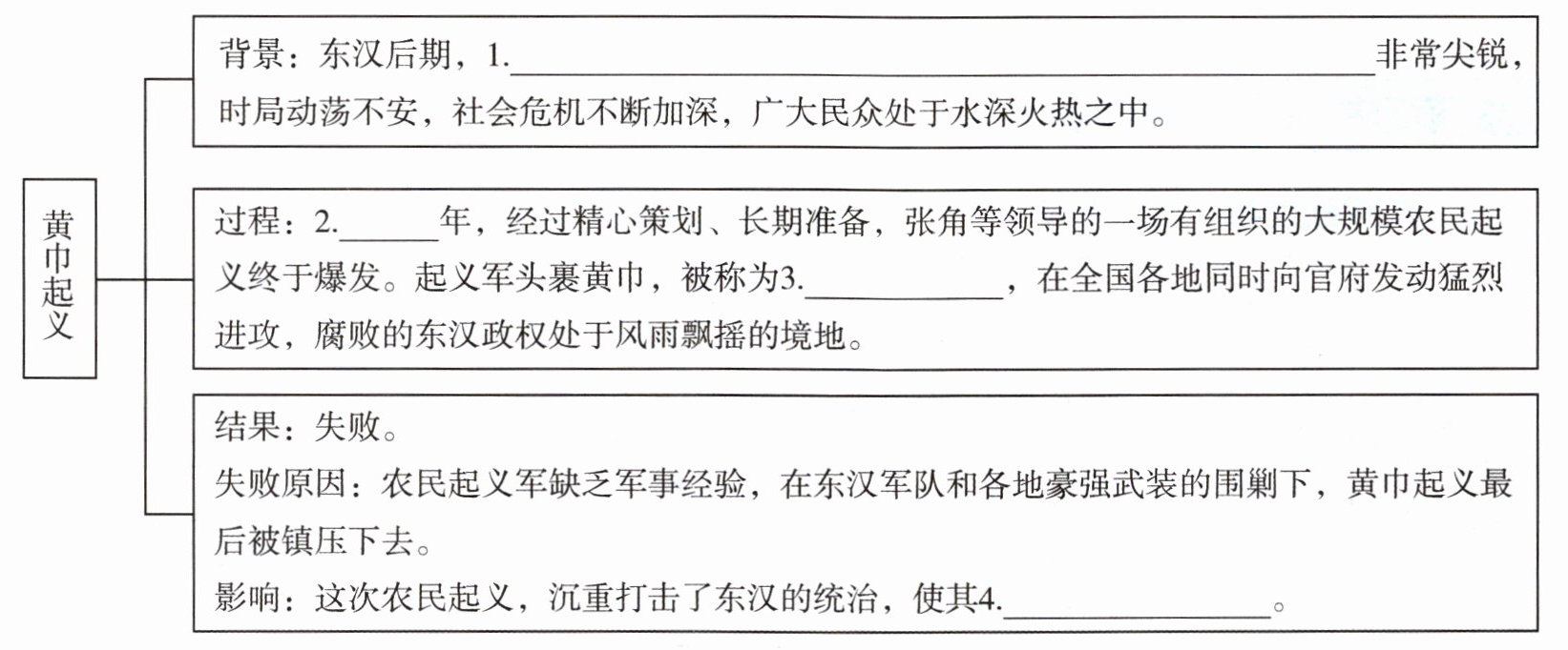 1.阶级矛盾;2.184;3.黄巾军;4.一蹶不振