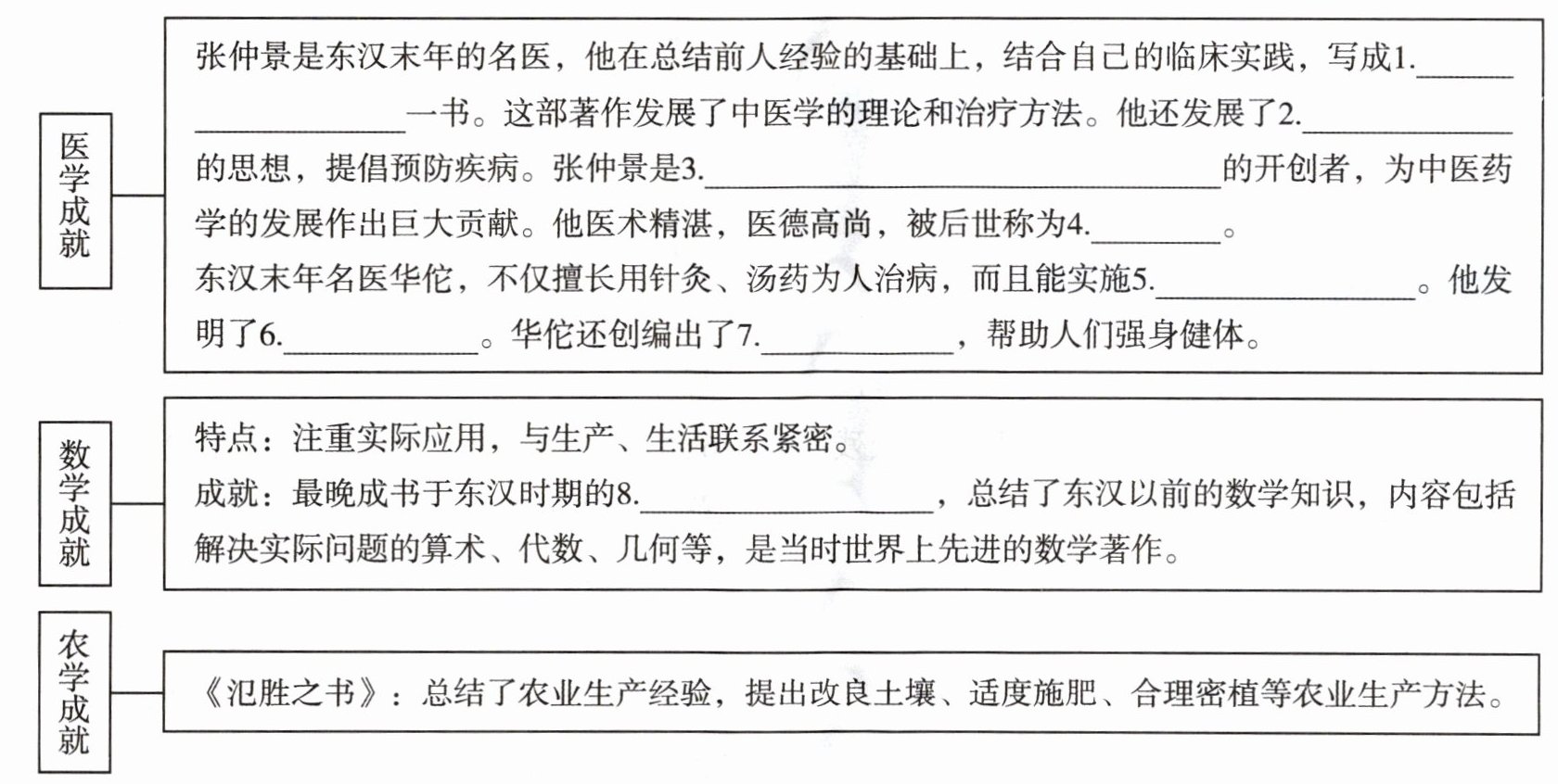 1.《伤寒杂病论》;2.治未病;3.中医临床理论体系;4.医圣;5.外科手术;6.麻沸散;7.五禽戏;8.《九章算术》