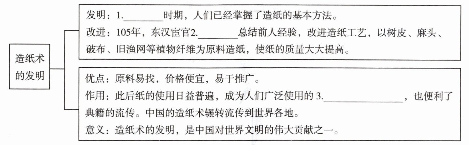 ,也便利了典籍的流传。中国的造纸术辗转流传到世界各地。意义:造纸术的发明,是中国对世界文明的伟大贡献之一。|