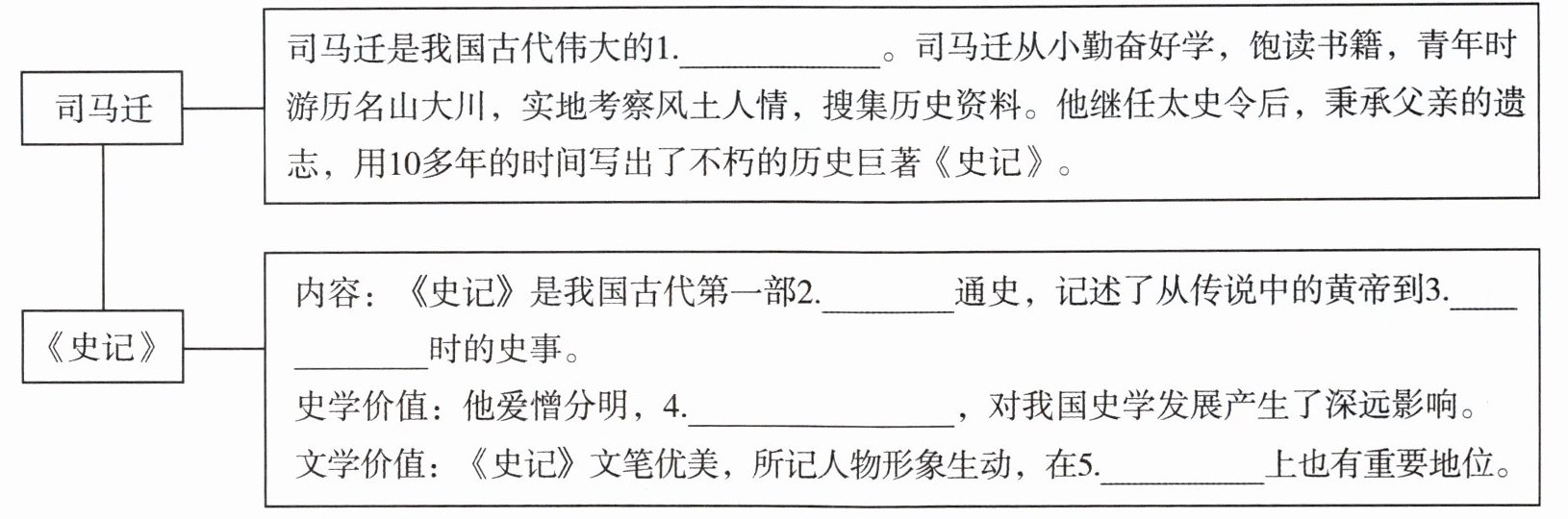 1. 历史学家;2. 纪传体;3. 汉武帝;4. 秉笔直书;5. 文学史。