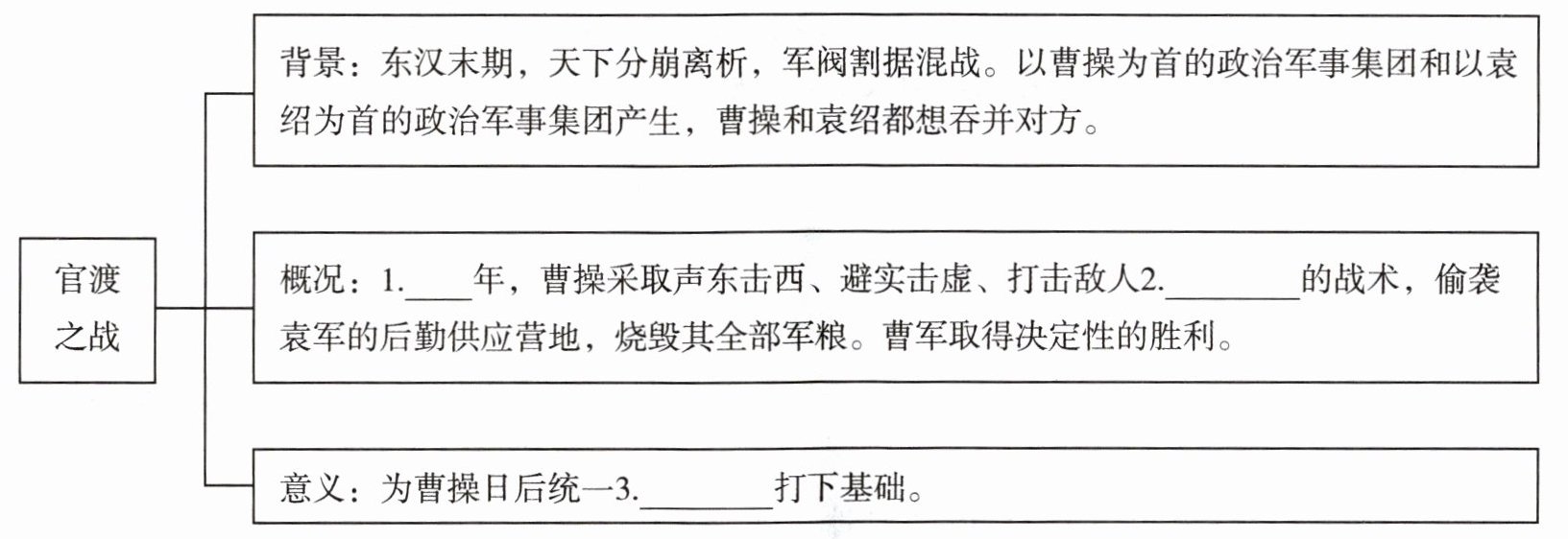 的战术,偷袭袁军的后勤供应营地,烧毁其全部军粮。曹军取得决定性的胜利。||意义:为曹操日后统一3.