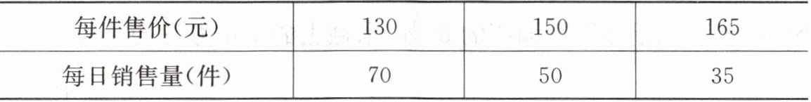11. 某商品每件的成本是 120 元,在试销阶段,发现每件售价(元)与商品的日销售量(件)始终存在下表中的数量关系,但每天的盈利额(元)却不一样. 为找到每件商品的最佳定价,商场经理请一位营销策划员通过计算得出如下结论:在不改变每件售价(元)与日销售量(件)之间的数量关系的情况下,每件定价为 $ m $ 元时,每日盈利额可达到最佳数 1600 元. 如果请你做这位营销策划员,那么 $ m $ 的值应为多少?