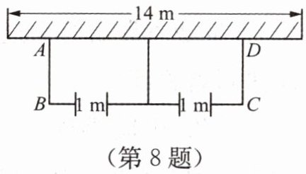 8. 如图,要建一个总面积为 $45$ m^2 的长方形养鸡场(分为相同的两片区域),养鸡场的一边靠着一面长为 $14$ m 的墙,另几条边用总长为 $22$ m 的竹篱笆围成,每片养鸡场的前面各开一个宽 $1$ m 的门. 求这个养鸡场的长与宽.