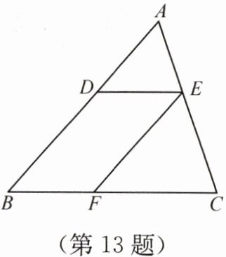 13. 如图,在$\triangle ABC$中,$DE// BC$,交$AB于点D$,交$AC于点E$,$EF// AB$,交$BC于点F$.已知$\triangle ADE的面积为4$,$\triangle EFC的面积为9$,求$\triangle ABC$的面积.