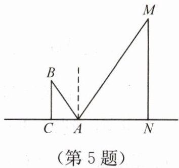5. 如图,小明为了测量高楼 $ MN $ 的高度,在离 $ N $ 点 $ 20m $ 的 $ A $ 处放了一个平面镜,小明沿 $ NA $ 后退到 $ C $ 点,正好从镜中看到楼顶的 $ M $ 点。若 $ AC = 1.5m $,小明的眼睛离地面的高为 $ 1.6m $,请你帮助小明计算一下楼的高度。(精确到 $ 0.1m $)