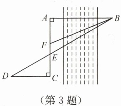 3. 为了测量一河岸两侧相对两棵树 $ A $、$ B $ 间的距离,如图所示,有四位同学分别测出了如下四组数据:①$ AE $,$ EC $,$ DE $;②$ AF $,$ FC $,$ CD $;③$ AE $,$ CD $,$ EC $;④$ EF $,$ EC $,$ CD $。根据所测数据,能求出 $ A $、$ B $ 间距离的共有