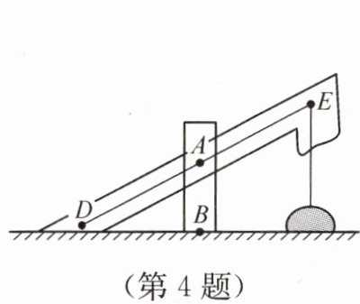 4. 如图为农村一古老捣碎器的示意图,已知支撑柱 $ AB $ 的高为 0.3 米,踏板 $ DE $ 的长为 1.6 米,支撑点 $ A $ 到踏脚点 $ D $ 的距离为 0.6 米。现从捣头点 $ E $ 着地的位置开始,到让踏脚点 $ D $ 着地,捣头点 $ E $ 上升了