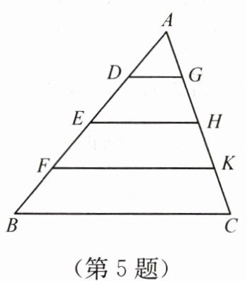 5. 如图,在 $ \triangle ABC $ 中,点 $ D $、$ E $、$ F $ 四等分 $ AB $,$ DG // BC // EH // FK $。若 $ BC = 20cm $,则 $ EH = $