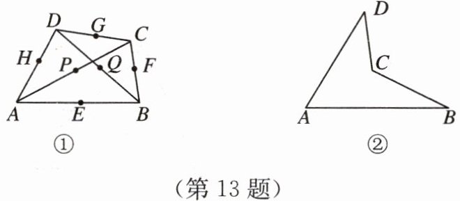 四边形 $ ABCD $,且线段 $ AB $、$ BC $、$ CD $、$ DA $、$ AC $、$ BD $ 的中点分别是 $ E $、$ F $、$ G $、$ H $、$ P $、$ Q $。(1) 若四边形 $ ABCD $ 如图①,判断下列结论是否正确:(正确的在括号里填“√”,错误的在括号里填“×”)