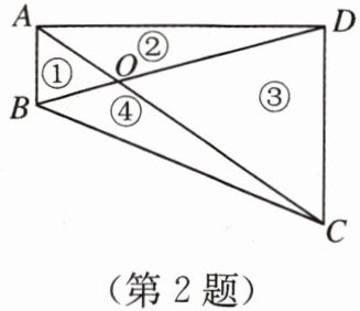 2. (无锡)如图,四边形$ABCD的对角线AC$、$BD相交于点O$,且将这个四边形分成①、②、③、④四个三角形. 若$OA:OC = OB:OD$,则下列结论中一定正确的是【