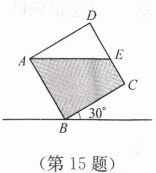 15. 如图,正方形$ABCD$为一个密闭容器的轴截面,当$BC与水平桌面的夹角为30^{\circ}$时,液面恰好过点$A$,若$BC = 6\,cm$,则液面$AE$的长度为