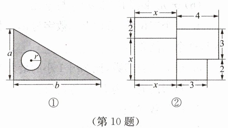 10. (1) 如图①(单位:$cm$),用代数式表示出三角板(涂色部分)的面积;