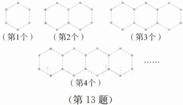 13. 如图所示,在由火柴棒拼出的图形中,第$n个图形由n$个正六边形组成,通过观察可以发现: