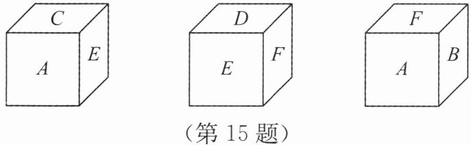 15. 一个正方体的六个面分别标有字母 $ A $、$ B $、$ C $、$ D $、$ E $、$ F $,从三个不同方向看到的情形如图所示.