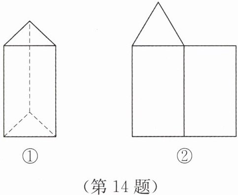 14. 如图①,该三棱柱的高为 $ h \, cm $,底面是一个每条边长都为 $ x \, cm $的三角形.