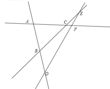 12. 已知三条直线两两相交于 $ A $、$ B $、$ C $ 三点,第四条直线 $ DF $ 交直线 $ AB $ 于点 $ D $,交直线 $ BC $ 于点 $ E $,交直线 $ AC $ 于点 $ F $,则共产生多少条线段?请根据题意画出图形.