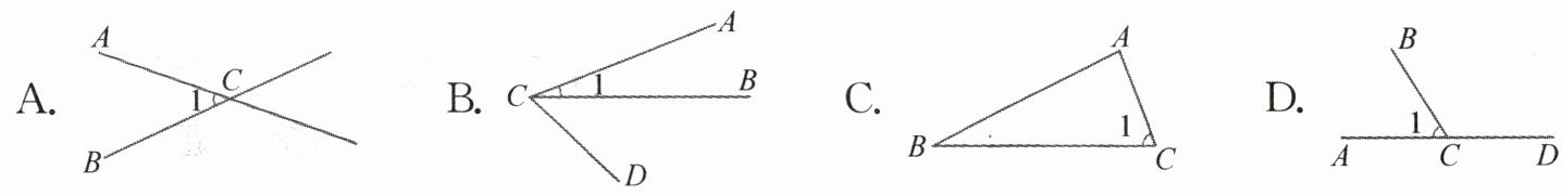 1. 下列图形中,能用$∠1$、$∠ACB$、$∠C$三种方法表示同一个角的是【