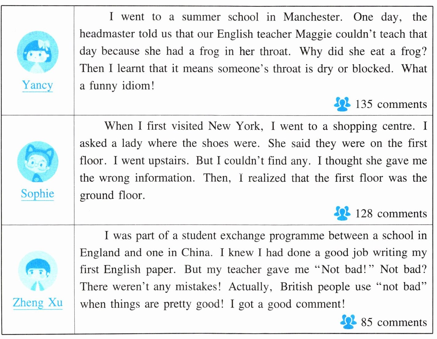 | Sophie | When I first visited New York, I went to a shopping centre. I asked a lady where the shoes were. She said they were on the first floor. I went upstairs. But I couldn’t find any. I thought she gave me the wrong information. Then, I realized that the first floor was the ground floor.