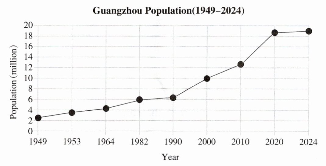Guangzhou has experienced dramatic population growth over the past seven decades. Guangzhou's population has risen from about 2.5 million in 1949 to nearly 19 million in 2024. In 1949, it had only about 2.5 million people. The population grew slowly to about 3.7 million by 1953. However, in the 1960s, the population grew very slowly. By 1982, the population was about 6 million and the population rose quickly after 1990. By 2000, it was close to 10 million. By 2020, the population had reached 18.7 million. Now, the population is still growing, but not as fast as before. It is expected to be around 21 million by 2025.
