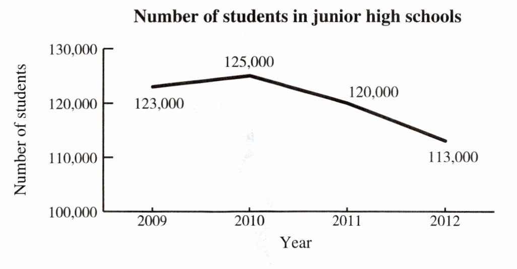 The graph shows the number of students in junior high schools from 2009 to 2012. In 2009, there were 123,000 students. In 2010, the number rose to 125,000. However, the number fell to 120,000 in 2011, and even fell to 113,000 in 2012.