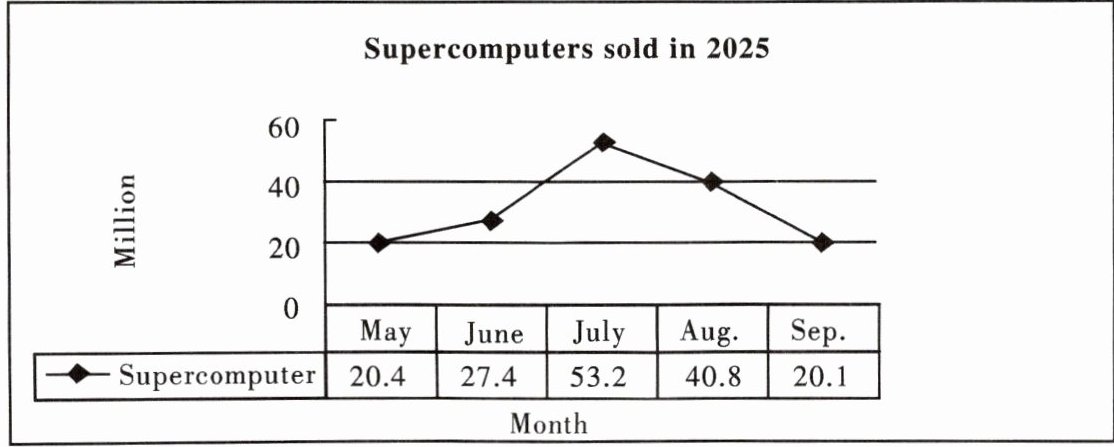 The graph shows that our company sold 20.4 million supercomputers in May. In June, the number rose to 27.4 million. In July, we sold the most supercomputers, the number of which is 53.2 million. In August, the number fell to 40.8 million. It fell again to 20.1 million in September.
